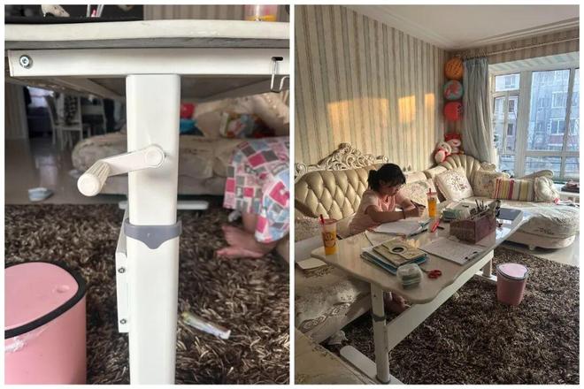 网友@暖小白:家里的茶几闲置很久了,本着不浪费的原则,网购了升降桌腿,再把茶几玉石面拆下来用免漆钉固定上去,刚好可以给孩子当书桌用。