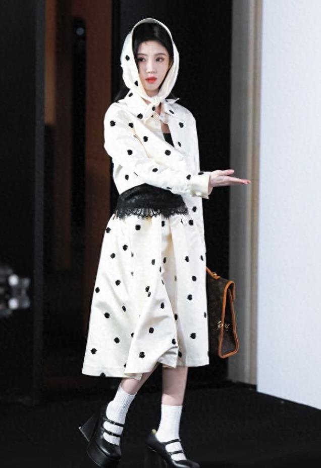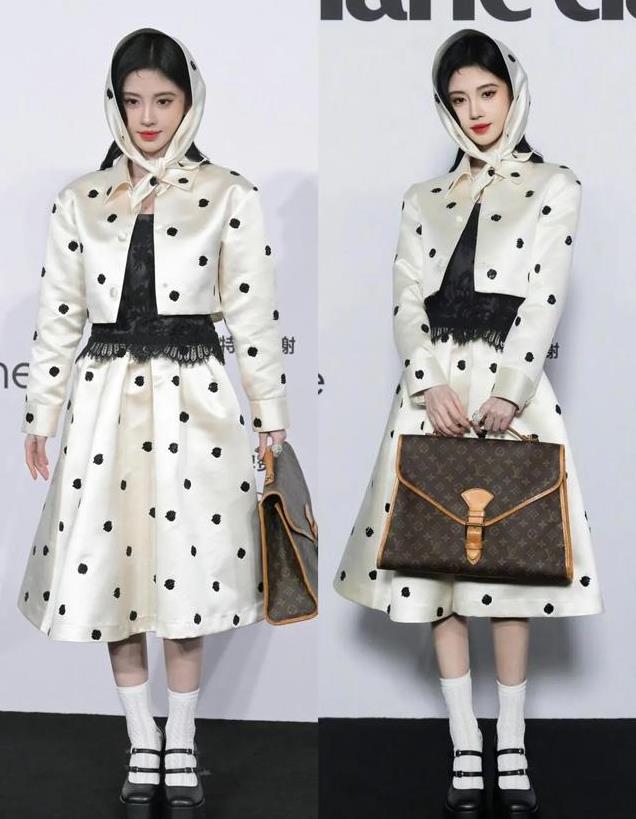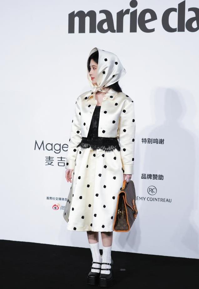 看看波点+黑白+三角头巾=萌哭了,搭配LV手袋平衡身上的甜美感,她这一身波点造型美的很小巧玲珑,也非常的清新和可爱,整体显得利落又不失优雅。
