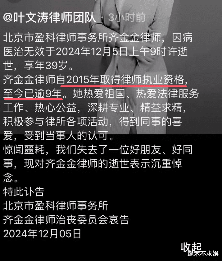 12月5日上午9点多,北京市盈科律师事务所齐金金律师去世,年仅39岁。