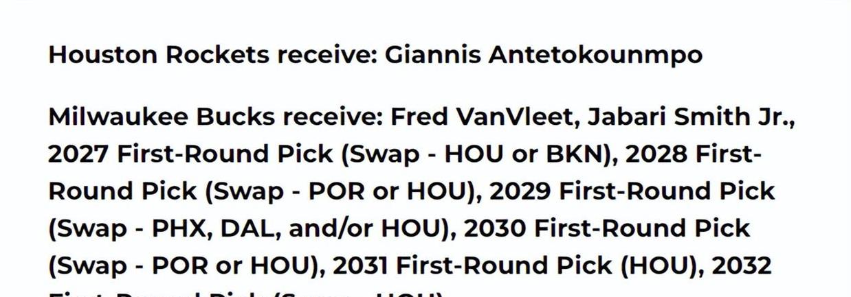 火箭追逐字母哥之前还有美国媒体建议火箭队去交易得到拉梅洛·鲍尔,不过看起来他好像也不是斯通和乌度卡想要的类型。火箭现在不想要那种只刷数据的球员,他们想要的是真正的巨星。斯通之前就是用杰伦·格林加上选秀权,成功换来了杜兰特,这说明他很清楚自己要什么。最近休斯顿本地媒体《spacecityscoop》在一篇新文章里建议,火箭可以用小史密斯加上一些选秀权作为主要筹码,去换雄鹿队的当家球星字母哥,这样能进一步提升球队实力,争取冲击NBA总冠军。名记Shams不仅爆料了福克斯和马刺续约的消息,还透露字母哥还在考虑自己的未来,目前还没有确定是否留在雄鹿。杜兰特和字母哥都是联盟顶级的巨星,而且字母哥才30岁,还处在巅峰期。如果火箭能同时拥有这两个人,夺冠的机会就大增,费尔蒂塔也能赚得更多。《spacecityscoop》认为,没有风就不会起浪,字母哥很可能会离开雄鹿,那对于火箭来说,机会就来了。