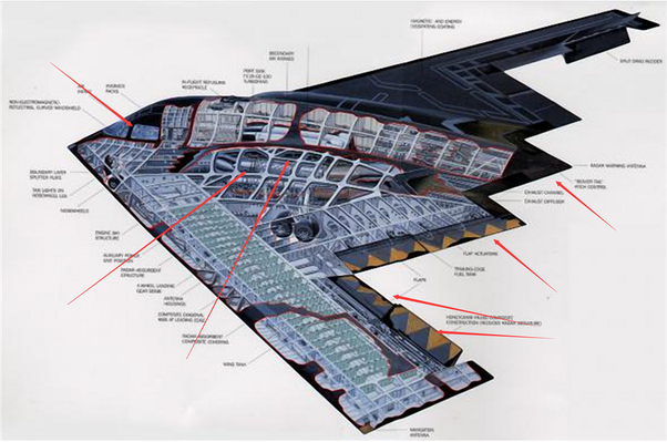 在弹舱方面B-21疑似采用了一主两辅的三弹舱设计。主弹舱尺寸比B-2单个弹舱略大。考虑到B-21的宣称载弹量仅仅是略超13.6吨,最多挂载一发长6.25米,直径0.8米,总重约13.6吨的gbu-57。美国可能会给B-21研发一款6吨级的精确制导弹药,以更加充分的利用弹舱空间。