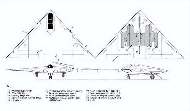 此外B-21的机身下部存在数个明显的阴影区,这些阴影是为了优化高速飞行能力,而使用的扭转设计,这种设计能够改善失速速度,降低诱导阻力。很多飞机都有这种设计,歼-10更是尤其能扭,只不过飞翼式飞机的前缘足够三角板,有了足够鲜明的对比,扭转就显得很突兀。