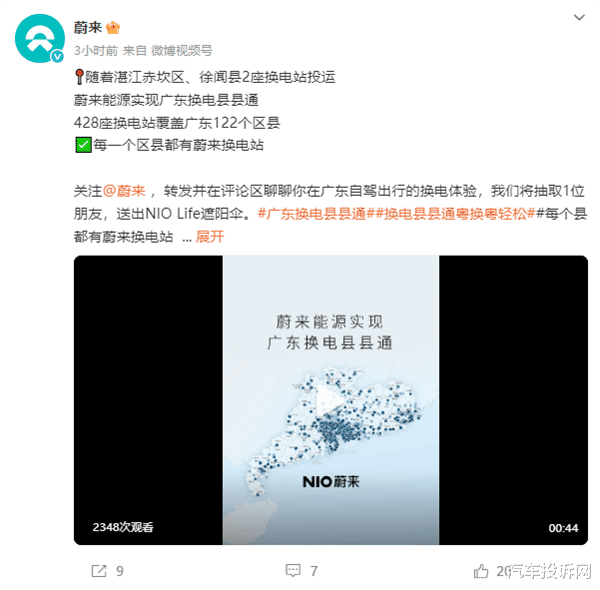 4月29日,蔚来汽车官方宣布,随着湛江赤坎区、徐闻县2座换电站的投运,蔚来能源在广东实现了换电县县通。目前,蔚来能源在广东已建成428座换电站,覆盖广东122个区县,确保每一个区县都有蔚来换电站。