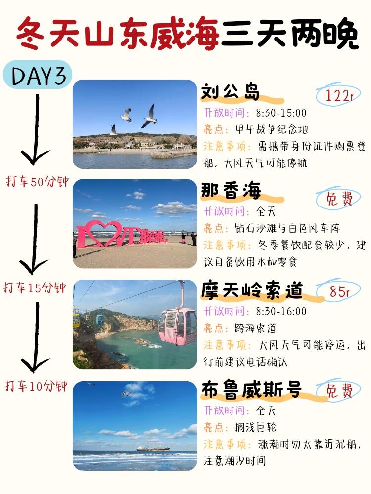 第三天去刘公岛了解历史⚓,再到那香海拍风车沙滩❄,去·摩天岭索道坐索道看风景,最后在布鲁威斯沉船看夕阳🚢
