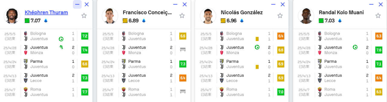 尤文图斯:后防线加蒂和凯利近期受伤,尤文防守即战力严重不足。前场伊尔迪兹停赛,库普梅纳斯受伤,进攻端火力同样受到影响。