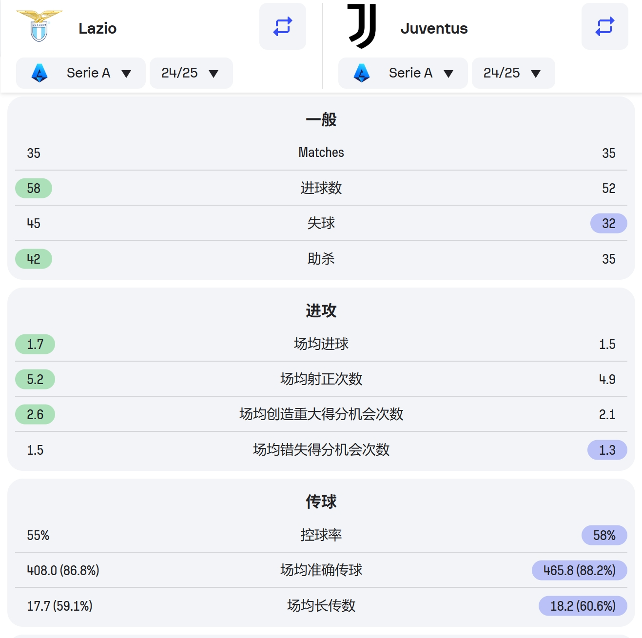 拉齐奥:拉齐奥近期比赛明显提升进攻节奏,近五场比赛场均控球率超过50%,面对几支下游球队都打出质量不错的破密防进攻。不过参考本赛季至今的强强对话,拉齐奥还是立足低位防守打反击,首回合客负尤文,进攻端多项数据成倍落后于对手,此役再战面对防守质量进一步提升的尤文,拉齐奥的进攻恐怕还是要遭遇限制,就看防守端的限制情况了。