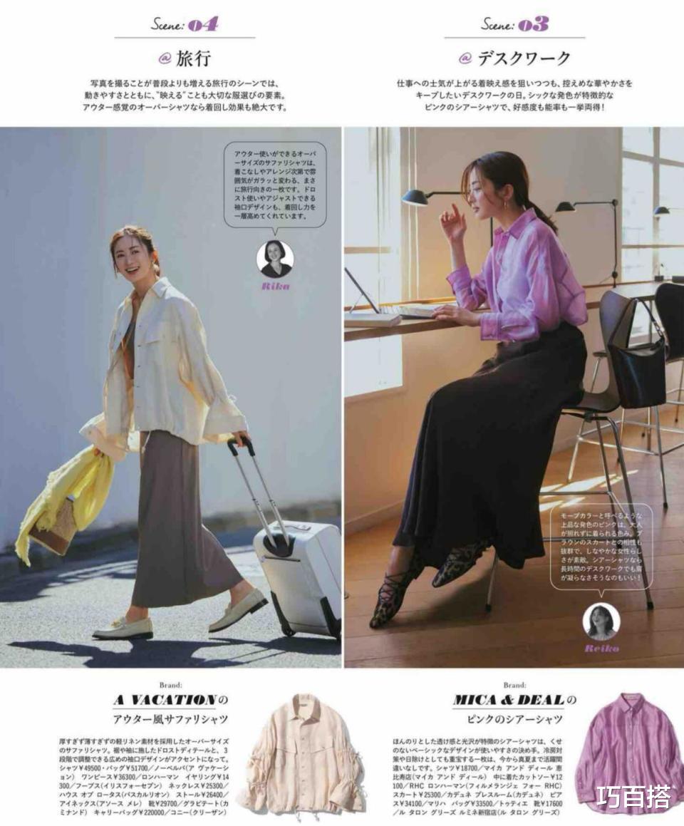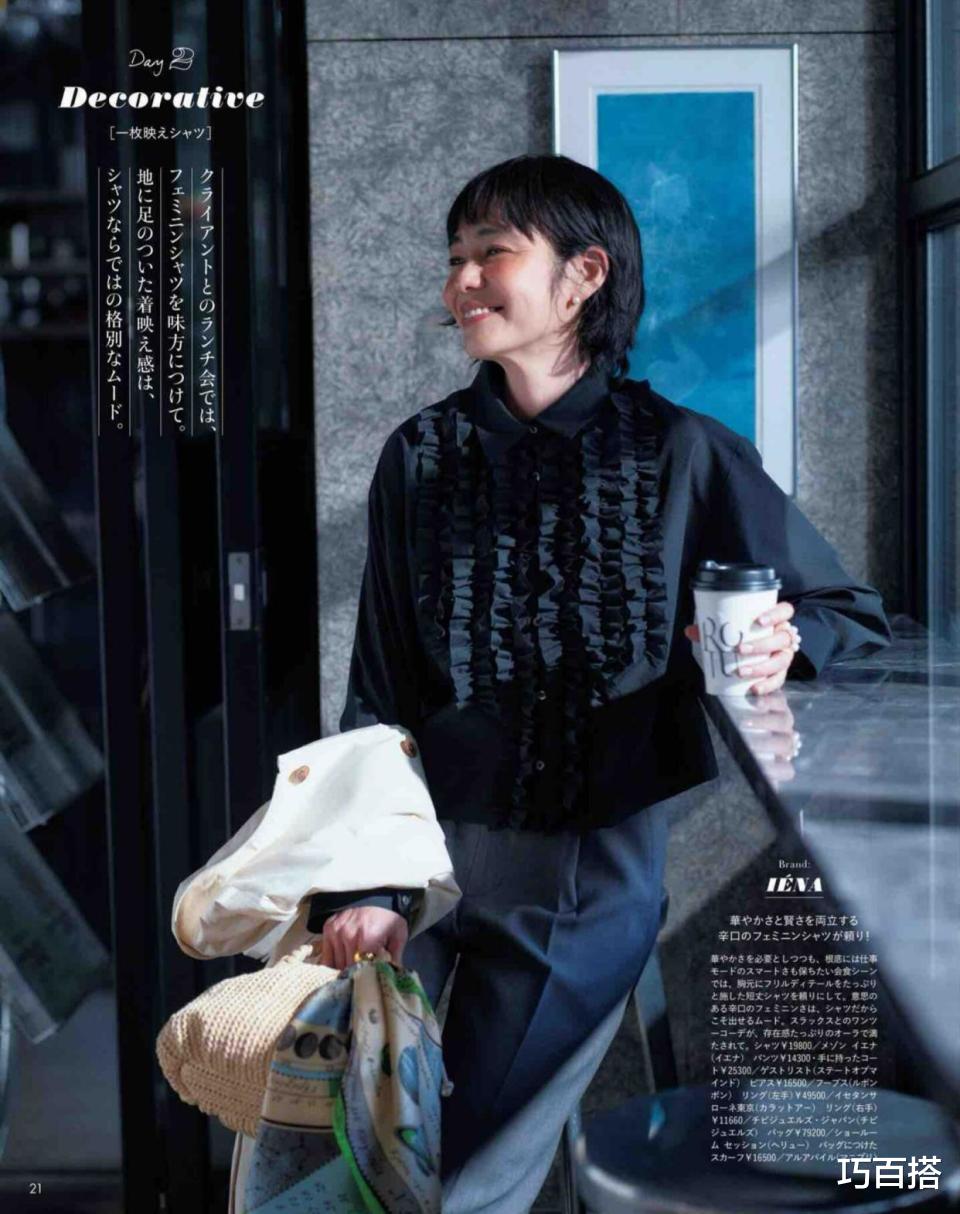 ·借鉴模板:白色衬衫+米色烟管裤+咖色乐福鞋,特别适合面试升职时学习借鉴。蓝色条纹衬衫+灰色西装裙+银色耳圈,约见客户时选择气场强大不出错。