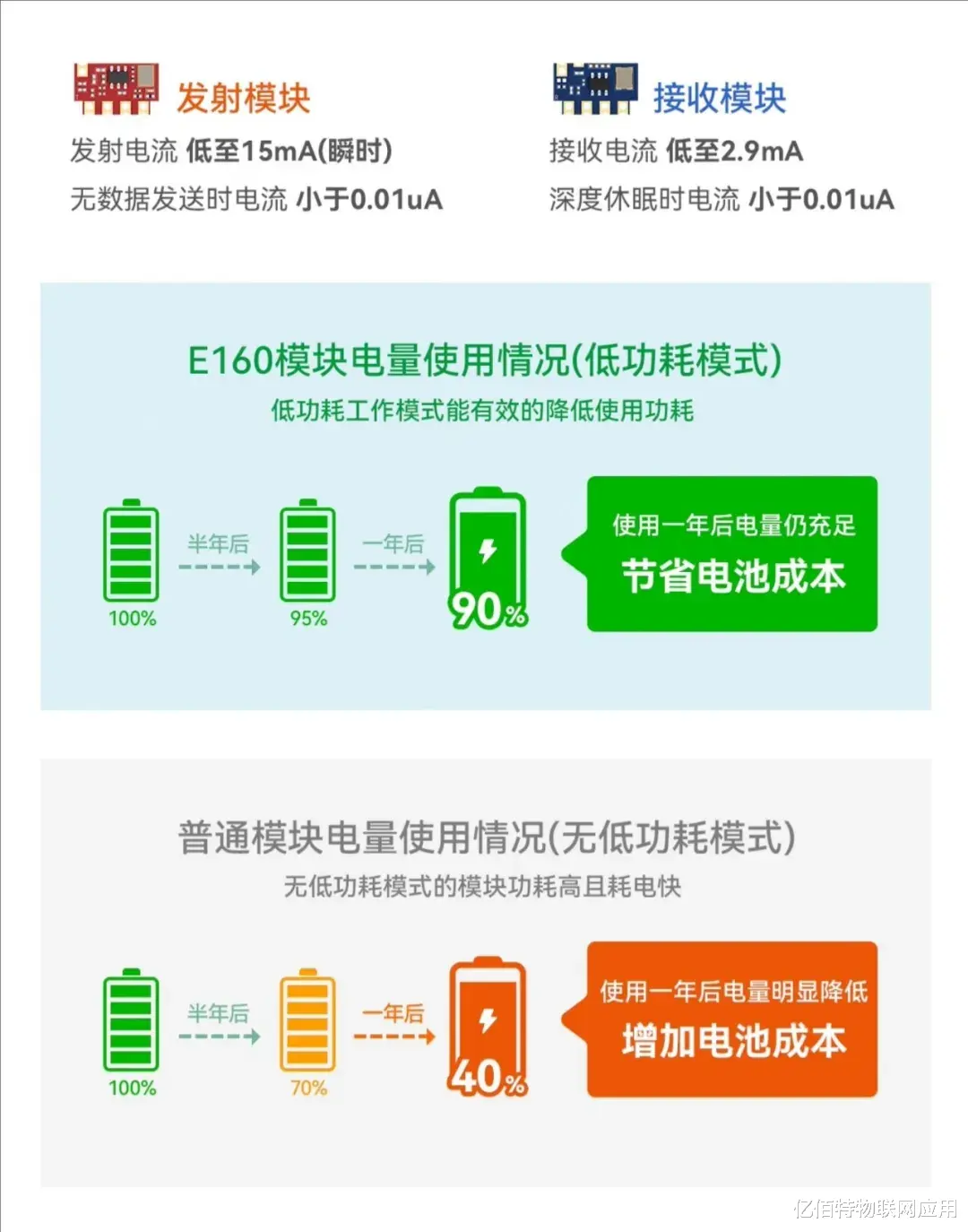 🔧低功耗、长续航:发射模块发射电流最低15mA,休眠电流<0.01μA。接收模块接收电流最低2.9mA,深度休眠电流<0.01μA低功耗模式下,使用一年后电量仍可保持90%以上
