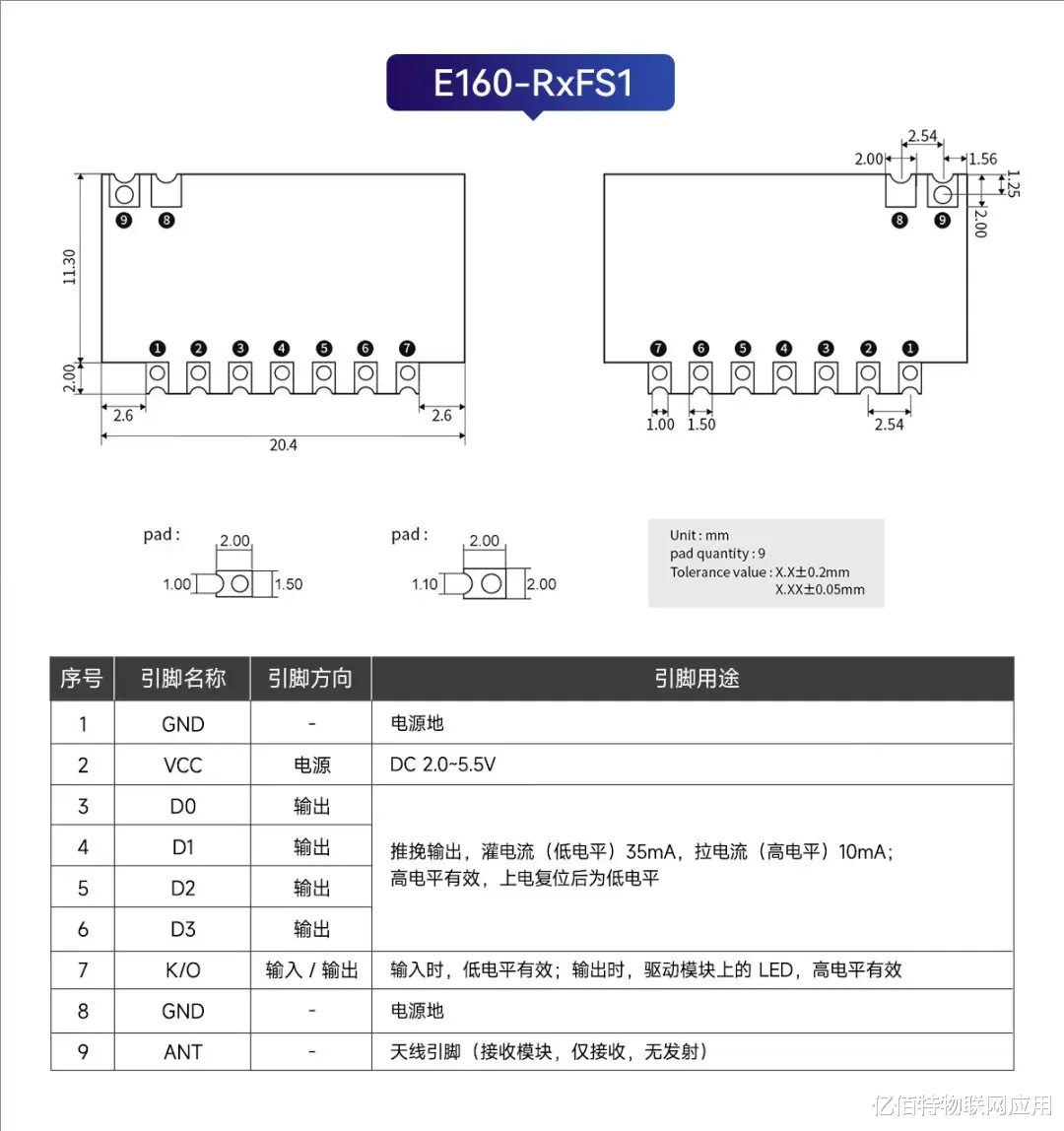 E160-RxFS2是一款OOK/ASK调制315MHz、433.92MHz带4路学习型无线接收模块。采用高性能芯片,抗干扰性能好;拥有 4路输出端口和1路输入端口(设置),可实现点动、翻转、互锁等输出功能,兼容 PT2262、PT2260、SC2260、SC1527、EV1527、RT1527、HS1527、EV527 等多种编码芯片,最多支持 40 个遥控器 学习;具有 小体积、高性能、宽电压、兼容性好等特点。OOK/ASK可通过FCC、CE认证,适用于简单控制应用:小家电遥控、玩具遥控、门禁系统遥控、电动自行车等应用场景。💻 小体积、耐高温:工作温度范围可达 -40℃~+85℃,适应恶劣环境。