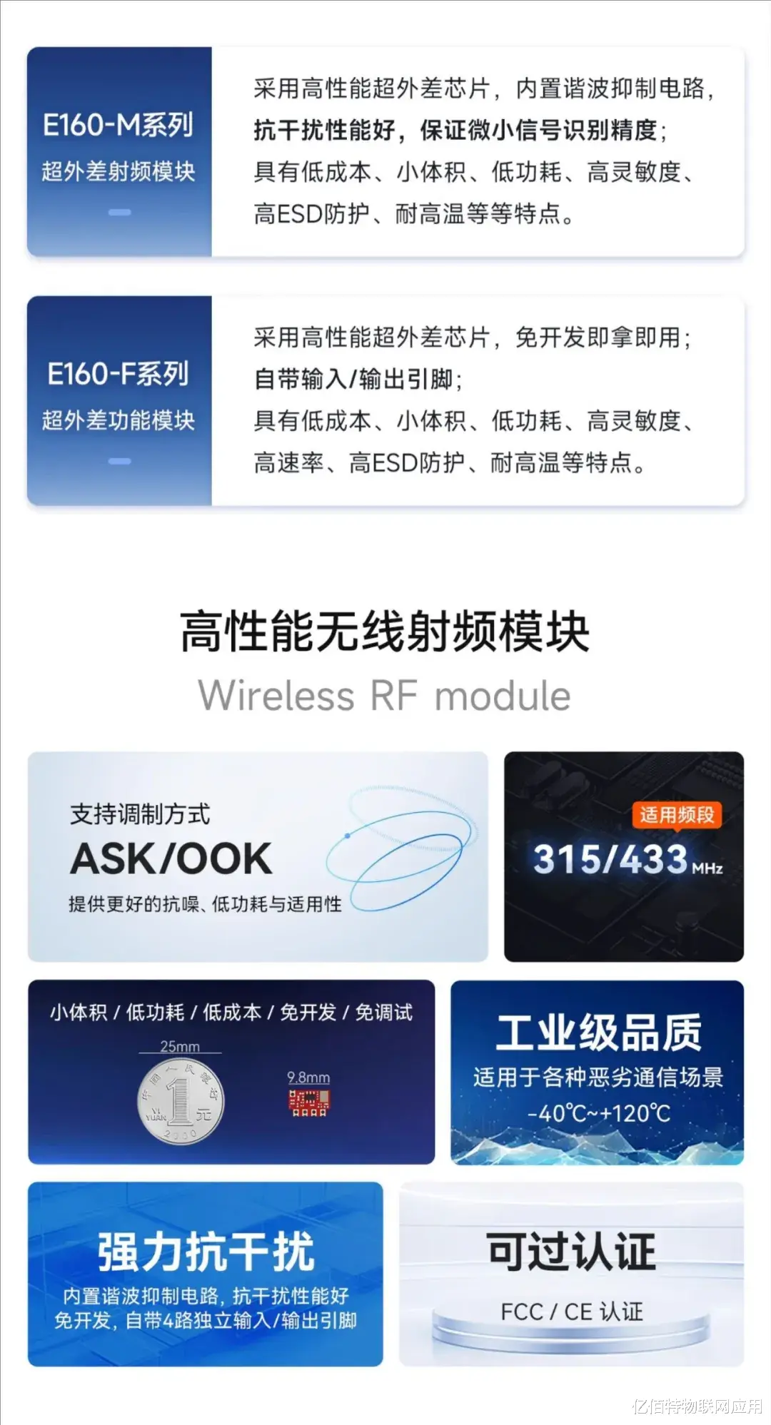 E160-F系列模块自带4路独立输入/输出引脚,支持点动、互锁、自锁等多种输出模式。兼容PT2262、EV1527等多种编码芯片,最多支持40个遥控器学习。📚 支持多种编码与学习模式:支持组合键、单键、任意键学习模式,数据断电不丢失,模式可切换📚已过认证,品质可靠:支持FCC/CE认证,符合工业级标准。