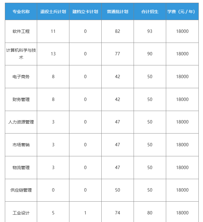 学费方面,多数专业学费为 18000 元 / 年,艺术类专业(动画、艺术与科技)学费为 19000 元 / 年,智能医学工程为最高学费专业(20000 元 / 年)。招生专业以工科、管理类为主,同时覆盖艺术类、语言类及医学技术类,适配不同专科背景学生的升学需求。