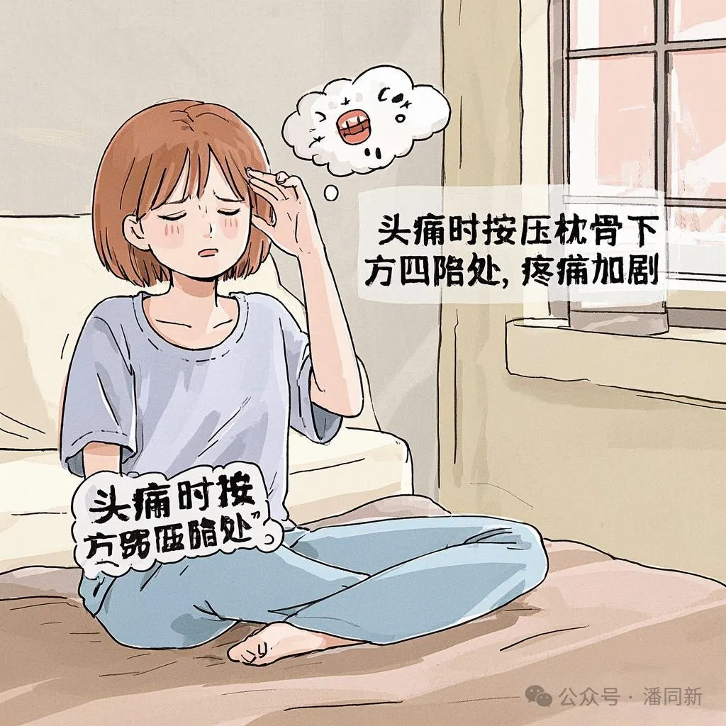 1️⃣ 头痛时按压枕骨下方凹陷处,疼痛加剧