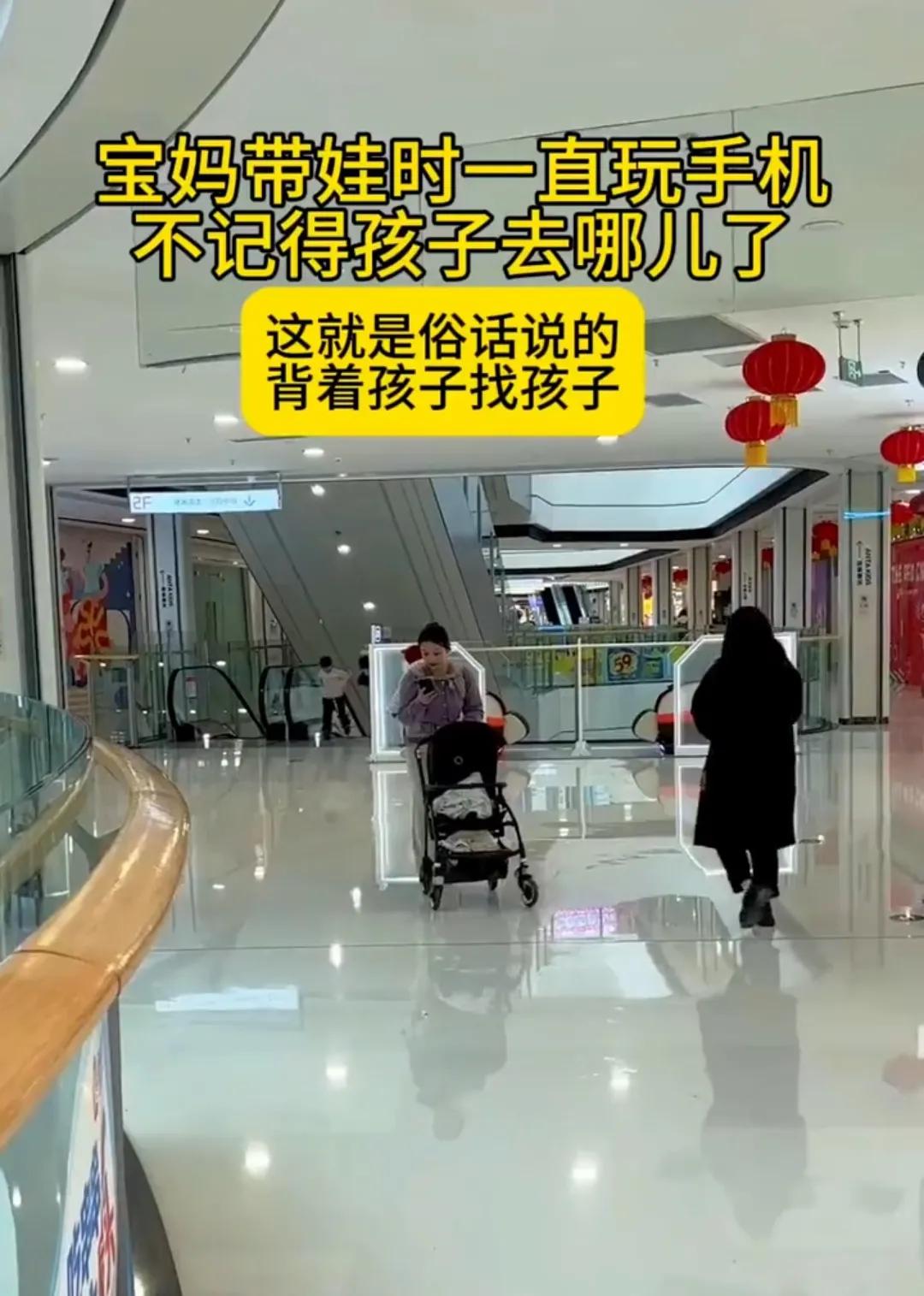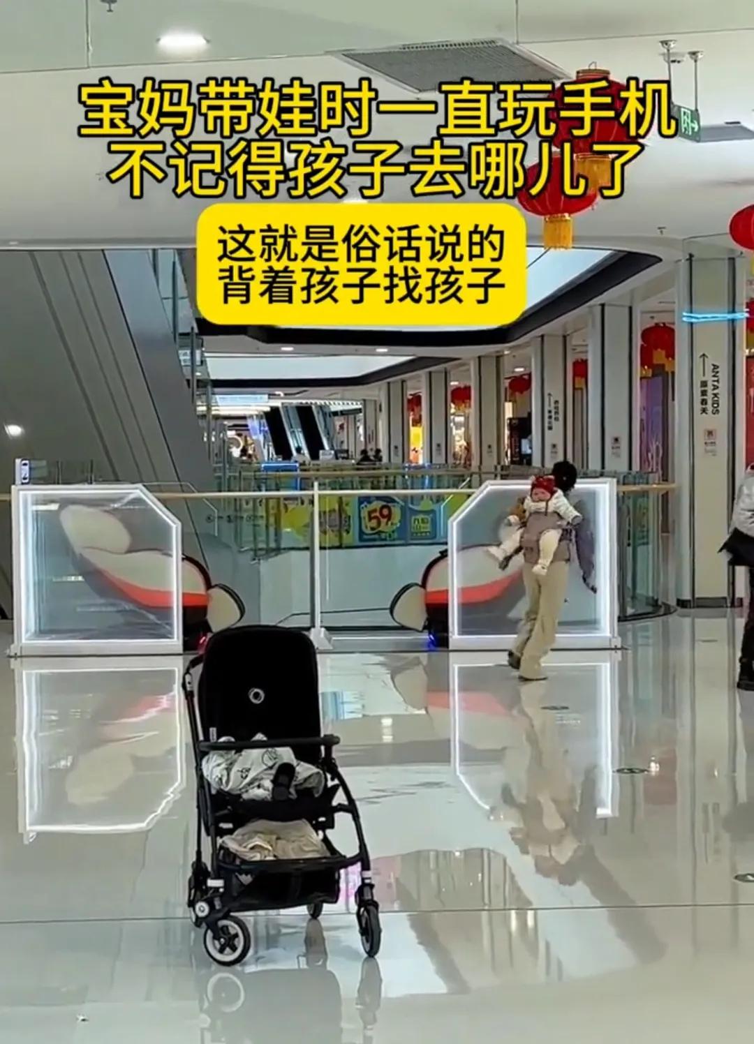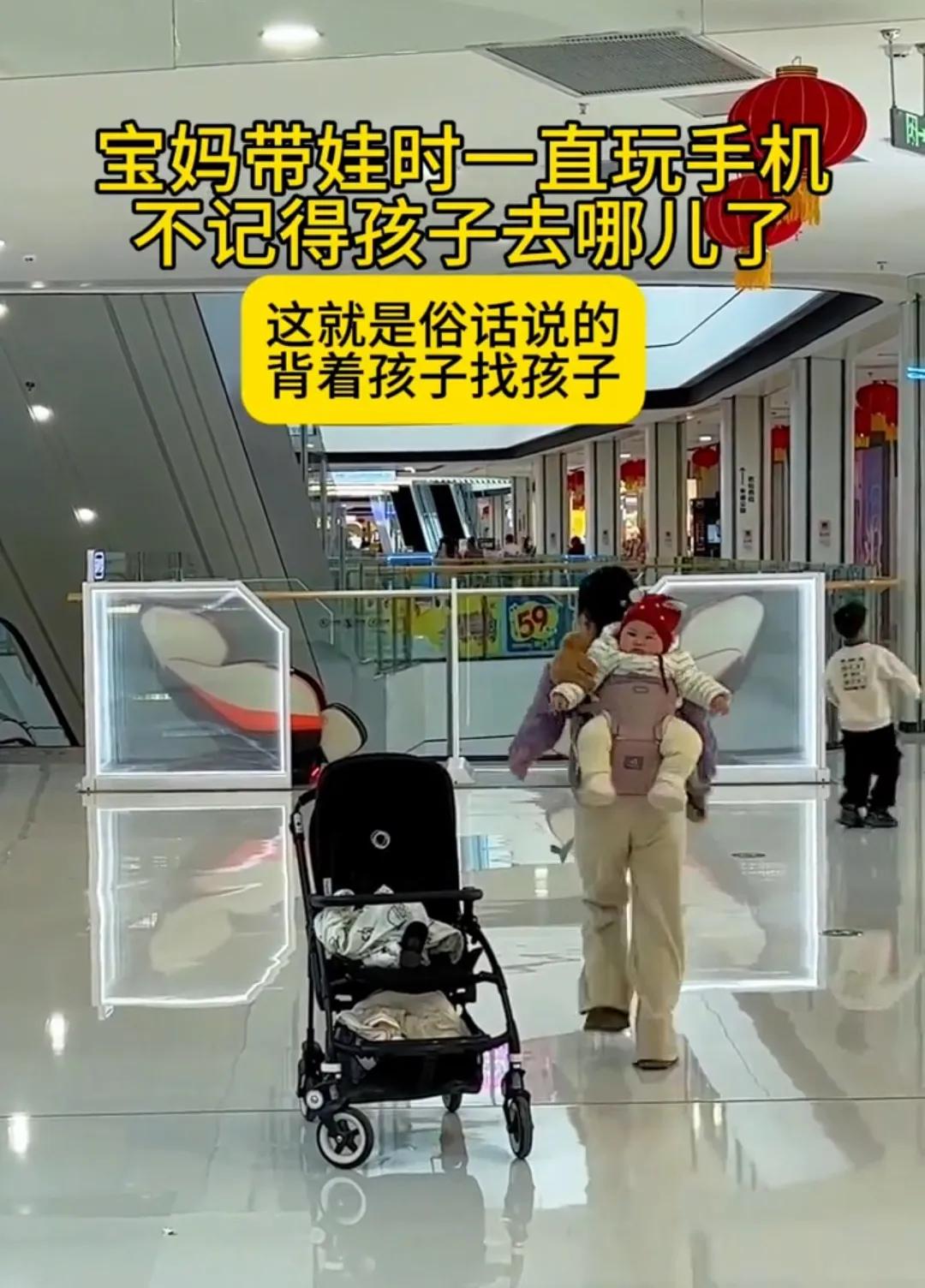 于是她将宝宝放入身后背袋里,感觉很无聊,便在商场里拿起手机一边推着婴儿车一边刷起抖音来。