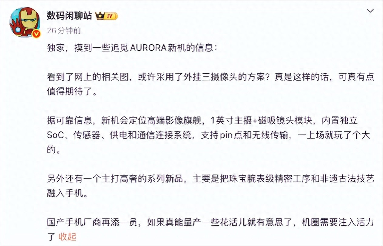 此外,“数码闲聊站”还爆料称,追觅AURORA会有一个主打高奢的系列,“主要是把珠宝腕表级精密工序和非遗古法技艺融入手机。”