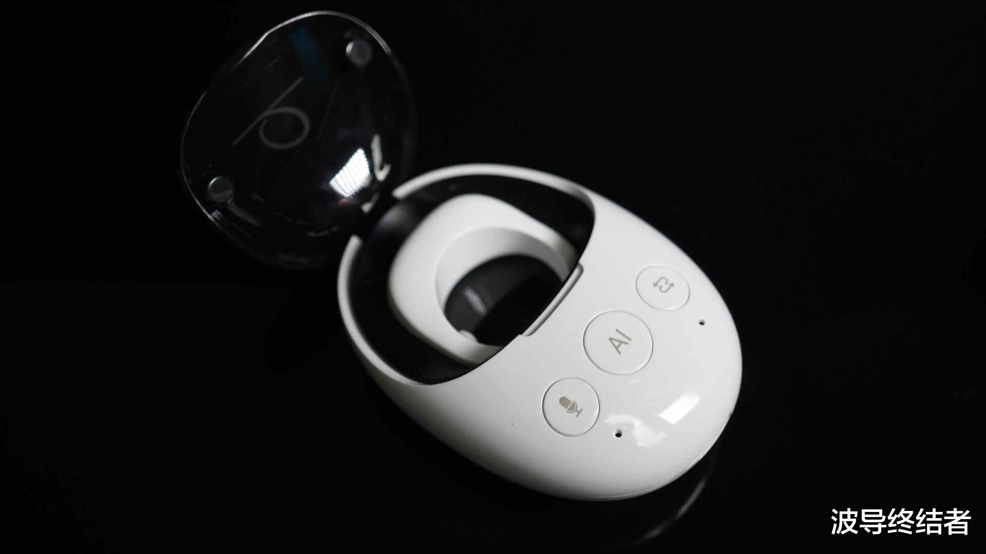 充电仓是一个蛋的形状,Type-C充电口在底部。正面有3个按钮和2个麦克风,左边的可以直接开启录音功能,会议记录等场景很好用。中间的是AI功能,集成了大模型和联网功能,还可以把录音内容进行转文字或者翻译功能。右边短按是同声传译功能,可以指定两种语言进行双向同声翻译,会见语言不通的客户非常好用。