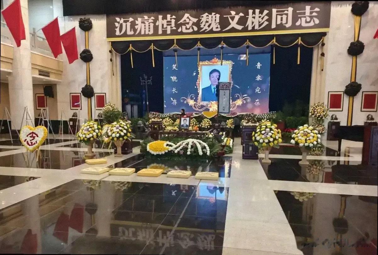 灵堂布置得很大,黑底白字的“沉痛悼念”高悬着,下面那张遗照里的魏文彬,眼神依旧是那副能洞察人心的样子。最扎眼的其实不是那些挽联,而是花丛正中间那个用花瓣精心拼出来的“念”字。一个字,胜过千言万语,那是一种还没来得及说出口的道别,也是活着的人心里那点无处安放的空落落。