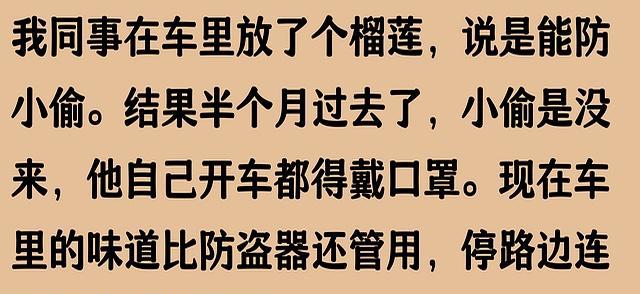 有个段子让我印象深刻:一个朋友在车内放了榴莲,结果成为了所有同事茶余饭后的笑谈。榴莲的味道就像是一场“生化危机”,在车内弥漫,连保安都受不了,要追着他让他把车挪走。这样的经历是不是让你捧腹大笑?或许这正是“车内物品选择”这一话题的真实写照:看似微不足道,却往往引发笑声和深思。