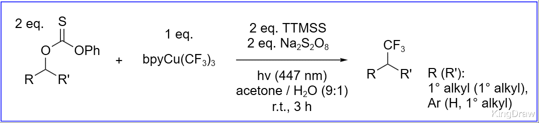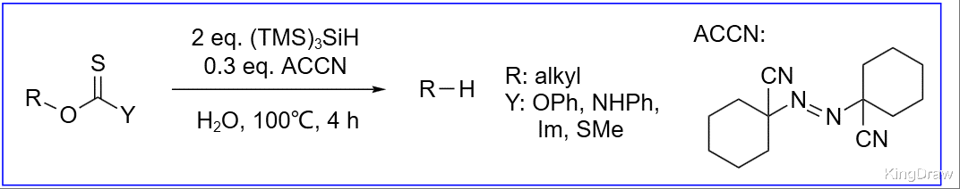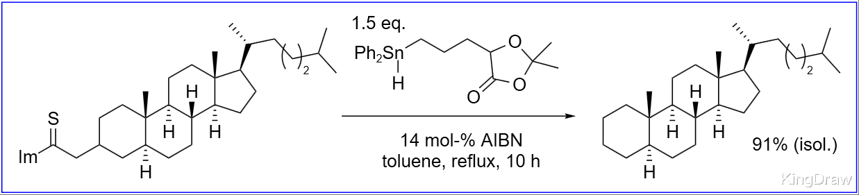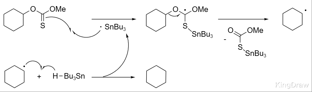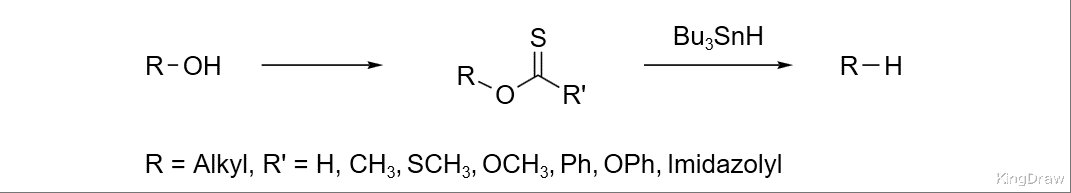 经典的方法是将醇转化为硫代酯衍生物,然后用 Bu3SnH 处理。一旦自由基连锁反应被引发,底物的硫原子进攻 Bu3Sn 自由基,底物中间体分解,生成烷基自由基,然后夺取 Bu3SnH 的氢自由基,实现循环。此反应的驱动力是稳固的 S-Sn 键。