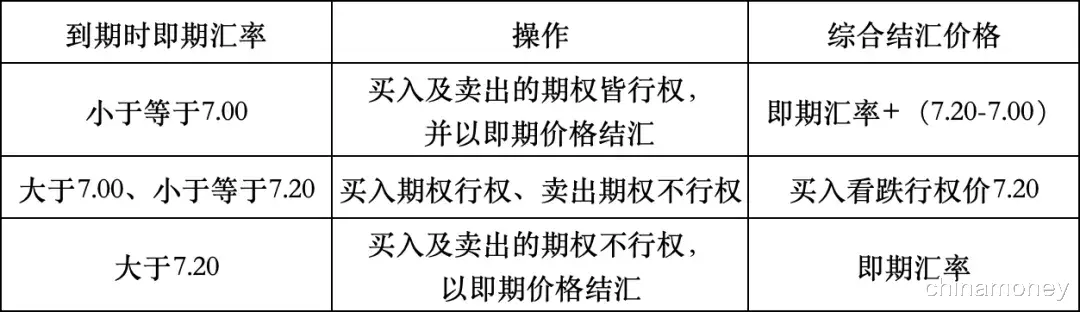 期权到期日,若美元兑人民币价格小于7.00,两个期权均被执行,企业获得2000pips行权净收益,综合结汇价格为:即期汇率+2000pips;若价格在7.00~7.20之间,买入期权行权、卖出期权不行权,企业以7.20结汇获额外收益;若大于7.20,两期权均不行权,企业按即期汇率结汇。