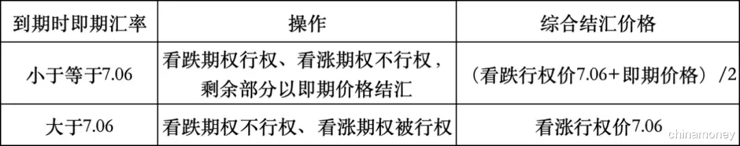 期权到期日,若即期汇率小于7.06,看跌期权行权、看涨期权不行权,企业以7.06结汇500万美元,剩余500万美元按即期价格结汇;若即期汇率大于7.06,看跌期权不行权、看涨期权被行权,企业以7.06的价格结汇1000万美元,结汇价格优于期初的远期结汇价格。