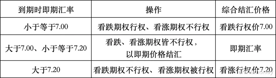 期权到期日,若即期汇率低于7.00,看跌期权行权,企业按7.00结汇,规避贬值风险;若汇率介于7.00~7.20之间,两个期权均不行权,企业按即期汇率结汇;若汇率高于7.20,看涨期权行权,企业需按7.20结汇。