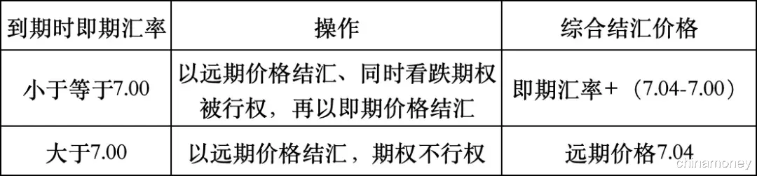 期权到期日,若市场即期汇率低于7.00,期权被行权,企业以7.00买入、7.04卖出美元获得400pips价差收益,同时以即期汇率结汇,实际结汇价格为:即期汇率+400pips;若市场即期汇率高于7.00,期权不行权,企业以远期价格结汇并获得期权费补贴。
