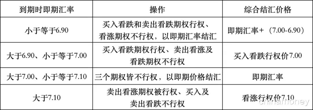 期权到期日,若即期汇率在6.90以下,买入看跌期权和卖出看跌期权行权、看涨期权不行权,企业按即期汇率结汇并获得1000pips的行权净收益;若汇率在6.90~7.00之间,仅买入看跌期权行权,企业以7.00结汇,价格优于即期汇率;若汇率在7.00~7.10之间,三个期权均不行权,企业按即期汇率结汇;若汇率大于7.10,仅卖出看涨期权行权,企业以7.10结汇。