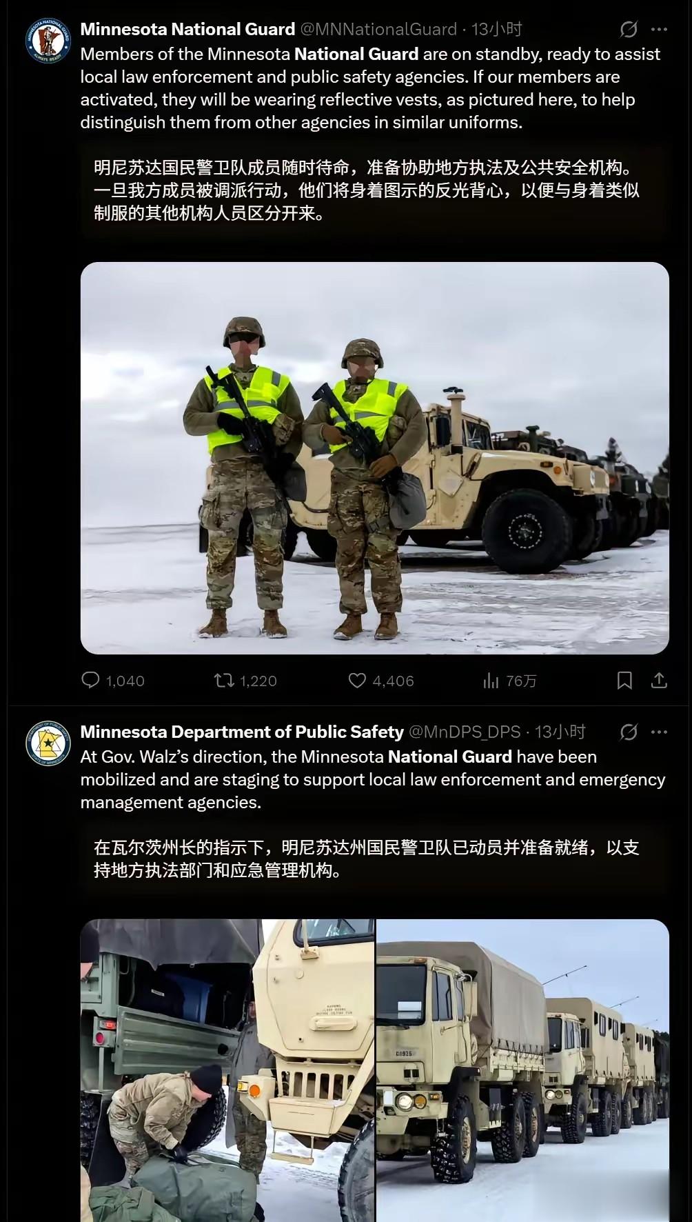 2. 军队待命:美国陆军已接到指令,约1500名擅长寒区作战的第11空降师士兵正随时准备开赴明尼苏达。