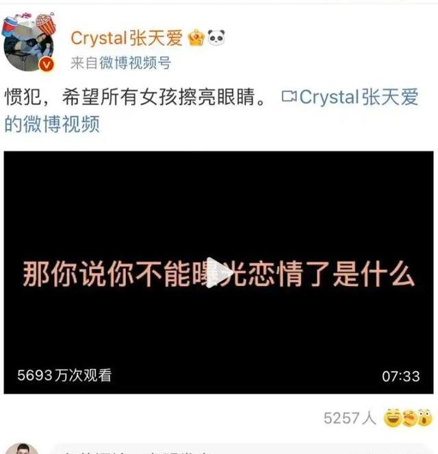 2022年8月25日,张天爱在社交平台发布文章,并配文:惯犯,希望所有女孩都擦亮眼睛。