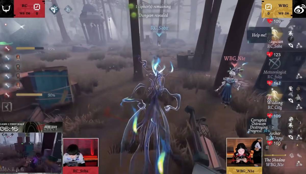 在第一局上半轮的比赛中北京WBG_N1e选出时空之影,时空之影选择将气象学家击倒送椅,求生者进行两次救援后,气象学家被击倒淘汰。随后时空之影与求生者围绕最后一台密码机展开拉扯,并将魔术师击倒送椅。野人救下魔术师后,魔术师被击倒送椅,密码机破译完毕。开门战中时空之影利用闪现淘汰弓箭手,完成三抓。下半轮的比赛中RC_Aka选出梦之女巫,开局梦之女巫选择追击大副,大副利用地形和怀表牵制梦之女巫接近四台半密码机后被击倒。不久后双方进入开门战,梦之女巫选择淘汰魔术师,完成二抓。北京WBG第一局取得优势。