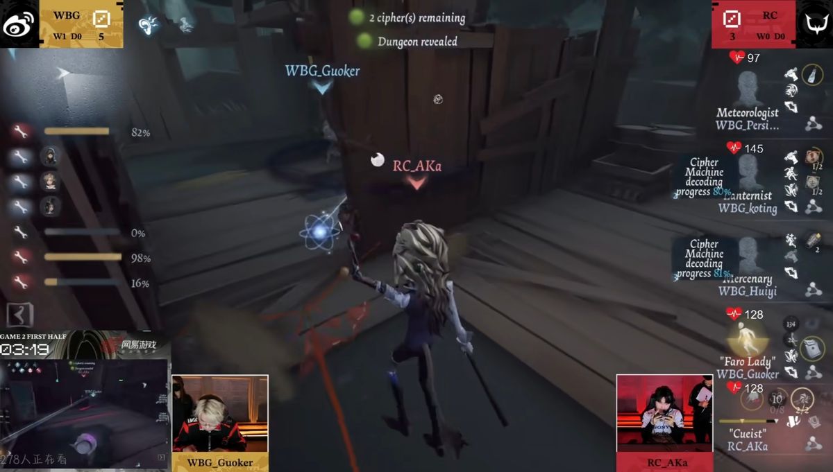 第二局上半轮的比赛中RC_Aka选出“台球手”,“台球手”选择追击“法罗女士”,“法罗女士”牵制接近三台半密码机后被击倒送椅。佣兵无伤救下“法罗女士”,下椅的“法罗女士”牵制一段时间后被击倒送椅,气象学家前来救下“法罗女士”后,求生者将密码机破译完毕。开门战中“法罗女士”被淘汰,求生者完成三跑。下半轮的比赛中北京WBG_N1e选出了杂货商,开局杂货商选择追击古董商,将其击伤后换追玩具商,并利用闪现将其击倒送椅。火灾调查员和守墓人轮流救下玩具商后,玩具商被淘汰。随后杂货商经过数次换追换挂后,选择将古董商击倒,密码机破译完毕。开门战中杂货商利用藤蔓淘汰守墓人和火灾调查员,完成三抓。北京WBG战队取得了最终的胜利。