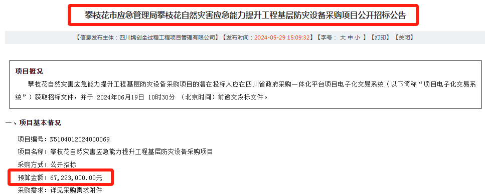 ●第一次财政监督:项目中标无效,却继续推进2024年5月29日,四川锦创全过程工程项目管理有限公司受攀枝花市应急管理局委托,发布了上述项目招标公告,预算金额为67223000元,共19个采购包。