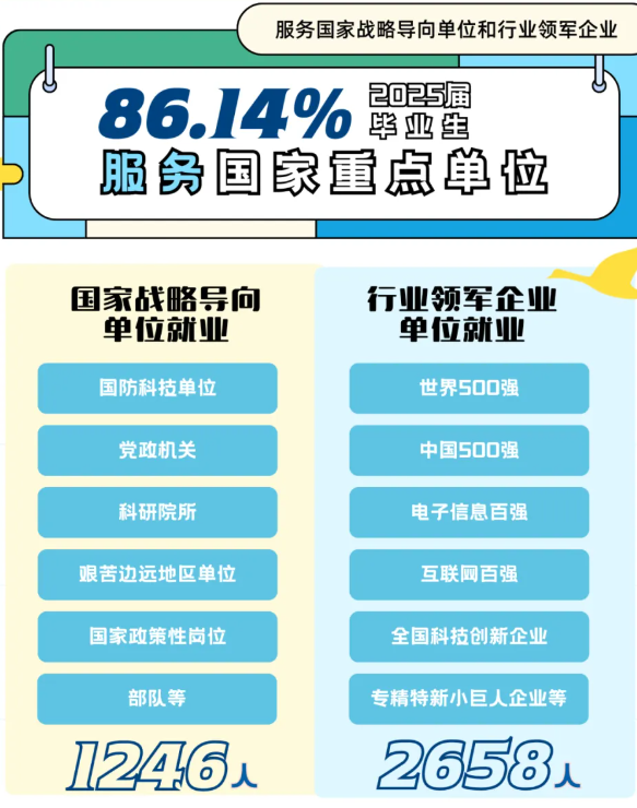 科研实力最终要落到人才培养上,这也是衡量一所大学价值的核心。可能有人会说,排名是学校的“面子”,就业率才是学生的“里子”。看看最新数据就知道:2025届全校毕业去向落实率高达94.35%。更关键的是,86.14%的毕业生都去了信息通信、国防科技这些国家战略领域,就连国家卓越工程师学院的首届毕业生,都清一色奔赴战略导向单位。