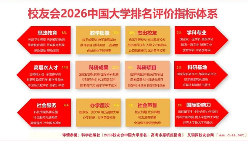 聊北邮的排名之前,得先搞清楚一个关键问题:校友会的排名,到底是按什么标准评的?很多人疑惑,同样一所学校,在不同榜单里名次差一截,核心就是评价指标不同。校友会这套体系包含12项指标,从思政教育到国际影响力都有覆盖,但细究权重就会发现,它妥妥是“科研导向型”——科研成果占20%、高层次人才占14%、科研项目占10%,光这三项加起来就超44%。