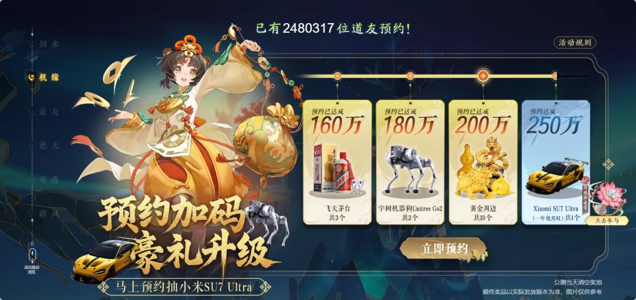 而且,《踏风行》官网预约人数达标后,官方还会开启劲爆实物的抽奖,飞天茅台、宇树机器狗、小米SU7 Ultra/问界M9一年使用权应有尽有!玩游戏还可能“一夜暴富”?不参加一下着实血亏!因此,各位道友赶紧去预约吧!
