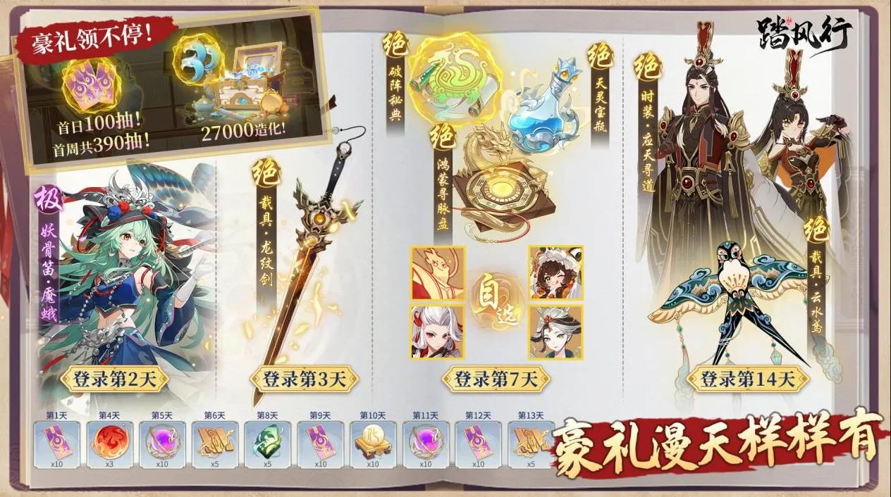 介绍了《踏风行》手游的多元斗法,是时候给大家介绍下福利了,《踏风行》官方这次是真·壕无人性!公测首日登录即送100抽,首周累计送390抽,抽资源抽到爽;连续签到还能白嫖极品器灵、绝品载具、绝品古宝、绝品时装等高阶道具。