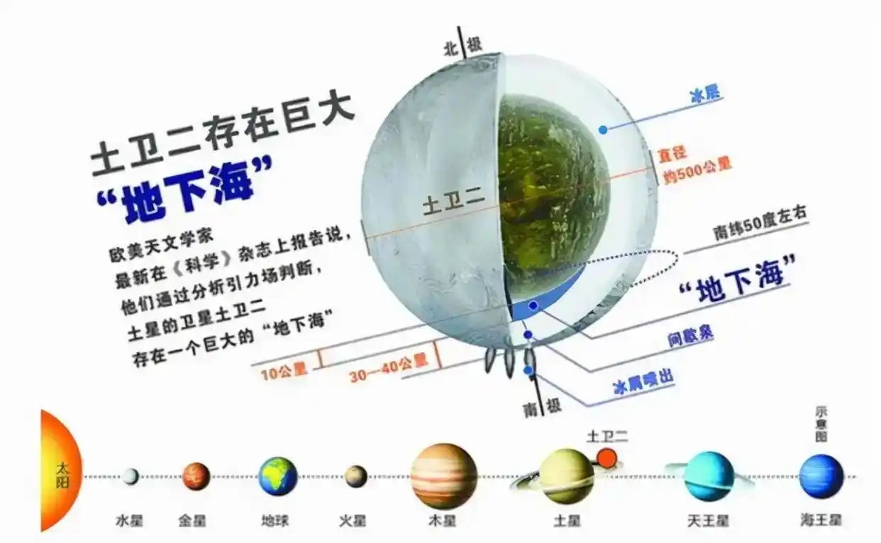 由于土卫二距离土星很近,且土星质量巨大,土星对土卫二产生了强大的潮汐引力作用。这种引力不断地拉扯和挤压土卫二,使得土卫二的核心产生了大量的热能,这些热能使得土卫二深海区域保持液态,形成了一个独特的 “地下生态圈”。