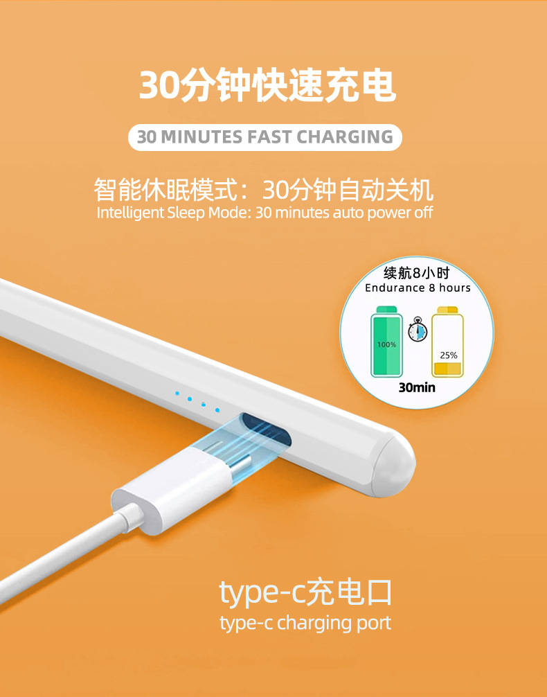这款电容笔采用了ABS笔身,单笔重量为13g,握在手里较为轻盈舒适,握持感还算不错。在书写体验上,这款采用了可替换耐磨笔头,长时间写画也不伤屏幕,并且还具备倾斜压感和全屏防误触功能,书写时能更据需求调整笔画的粗细深浅,书写体验感还算不错。在续航方面,由于它需120分钟才能充满,充满后使用时间为7h,整体续航表现略微不足,适合对续航要求不高的创作者。但值得一提的是它的电量屏显功能,我们能直观看到剩余电量,及时为电容笔充电。