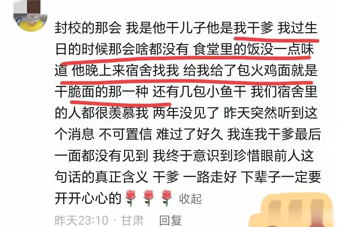 其中一位学生透露,在封校期间,自己是他的干儿子,过生日那会,还给他买了包火鸡面。