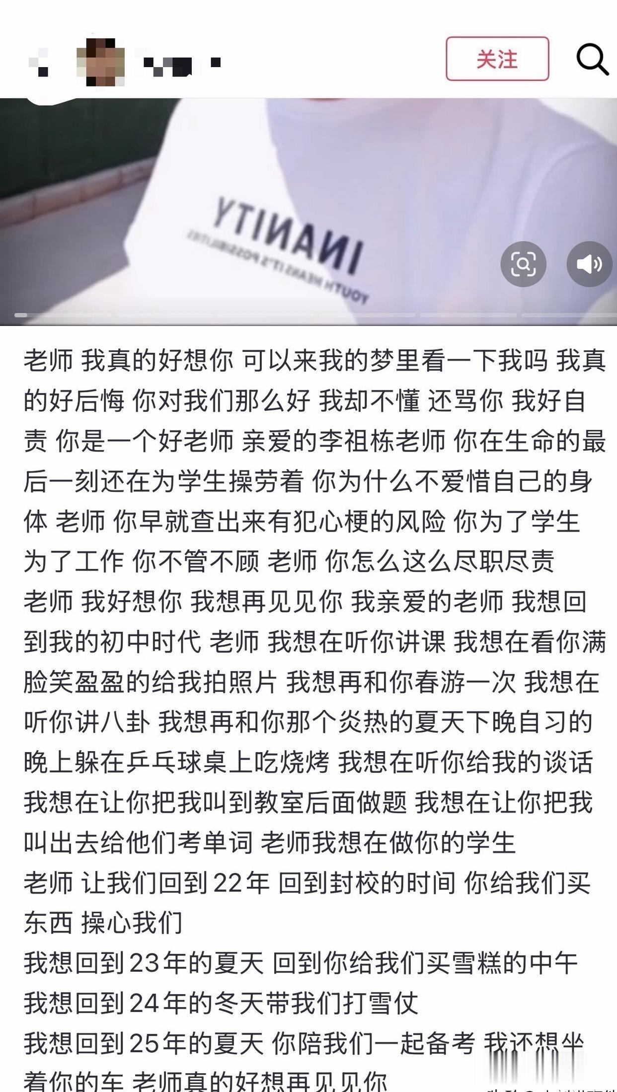 从这名学生的讲述来看,李祖栋生前尽职尽责,对他特别的好,他却不懂珍惜和感恩,反而骂了李老师,当他离去之后,才悔恨难当,然而如今却为时过晚,等醒悟过来,却连一声“对不起”都没机会说了!