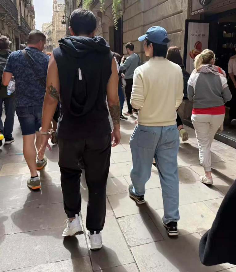 5月2日,有网友在西班牙巴塞罗那街头偶遇董子健。画面中,他身穿一件宽松长袖T恤搭配浅蓝色牛仔裤,头戴同色鸭舌帽,脚踩脏兮兮的帆布鞋,胡子拉碴的模样与荧幕上的清爽形象反差极大。尽管官方身高标注176cm,但镜头里的他显得瘦小单薄,与女粉丝合影时甚至被拍到偷偷踮脚,体态略显尴尬。