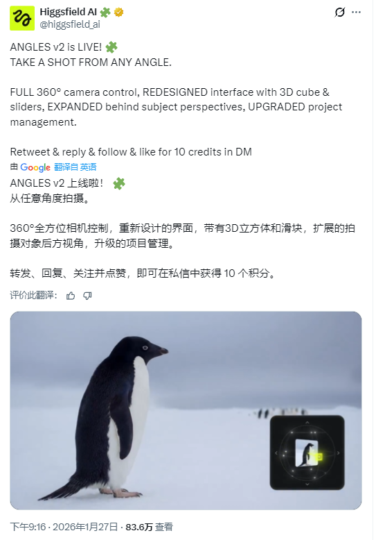 Higgsfield AI正式发布ANGLES v2,这一重大更新为创作者带来了前所未有的镜头控制力。通过创新的 “单场景 → 9帧多角度” 工作流,用户现可实现完整的360°相机视角控制,在数秒内快速探索不同的镜头语言、构图与景深,大幅提升分镜设计的效率与精准度。