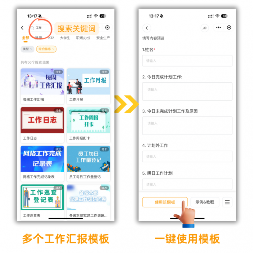 接龙管家内置了丰富的工作汇报模板,只需点"发起接龙",搜索"工作汇报",就能找到合适的模板。