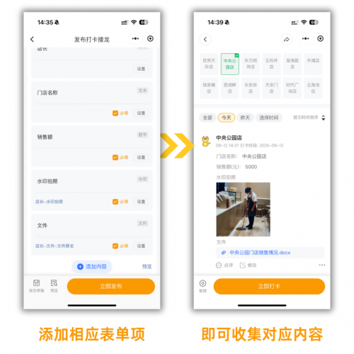 除了水印拍照,管理者还可通过添加不同的表单项,收集不同的工作数据,如:位置、文本、图片、文件(Word、PPT、Excel、压缩文件包等几十种文件类型),一条接龙全方位搞定各种格式的工作内容收集。