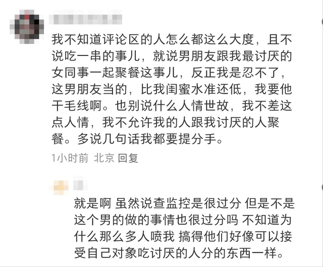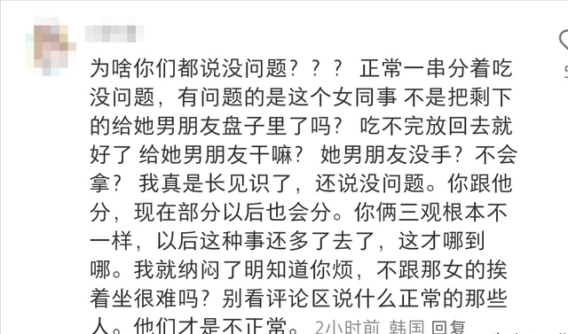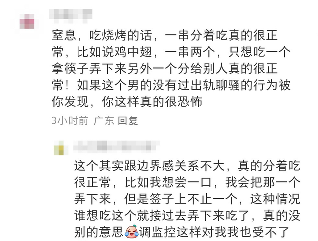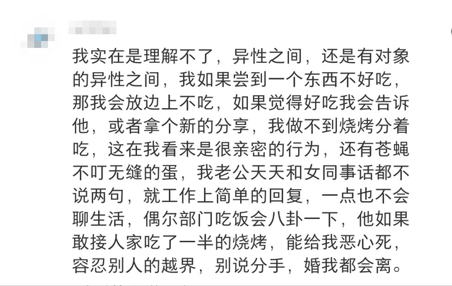 支持男友的一方认为:"烧烤本来就是分享的食物,同事之间这样很正常"