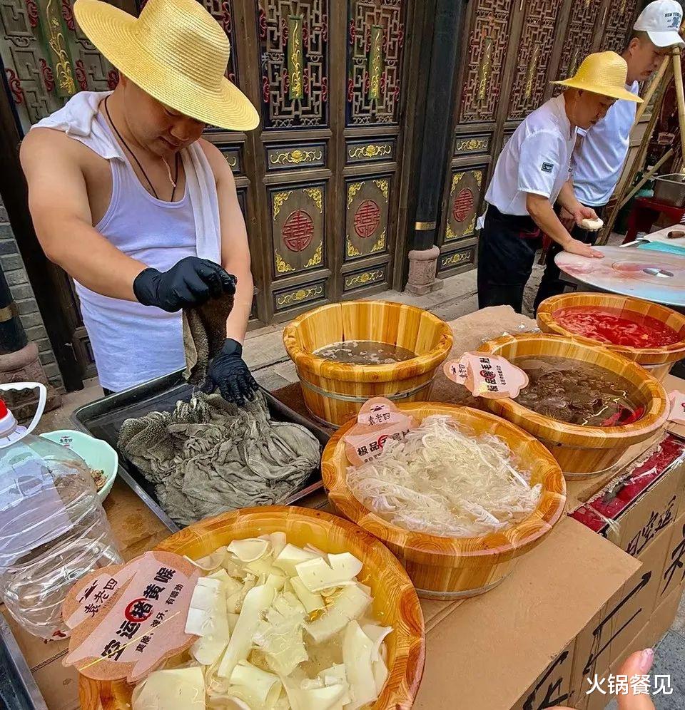 比如,最近袁老四老火锅做了一场“秀”,在店外大摆免费式体验,从各色水果捞、手搓冰粉、斑斓凉虾,再到酸辣粉、铁板炒饭等,10多种冰品小吃当开胃前菜,目的还是引客进店。
