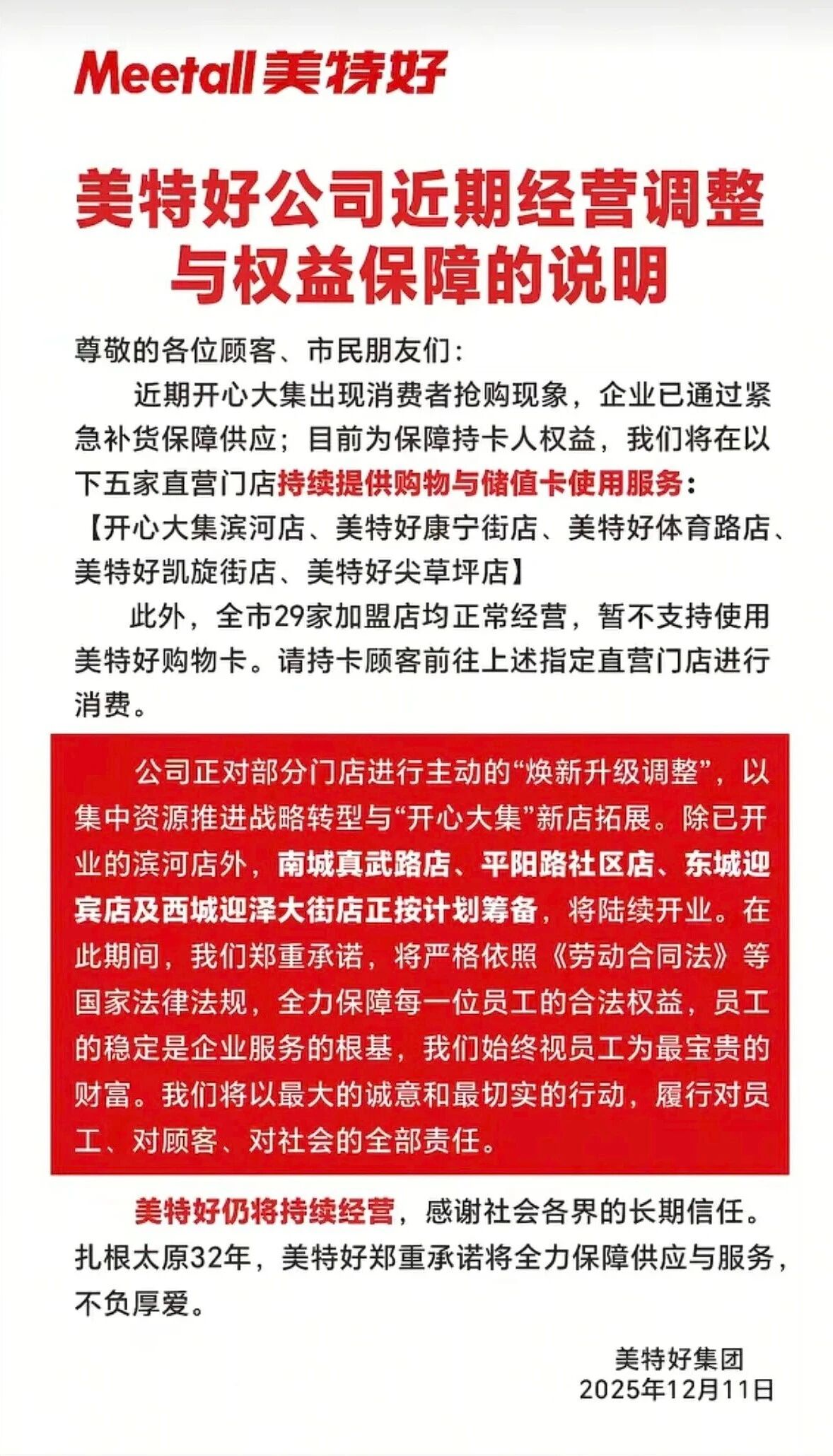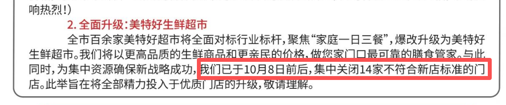 针对市场传言与消费者恐慌,美特好曾发布公告解释,称为集中资源推进新战略,公司于10月8日前后关闭了14家门店,未来将聚焦“美特好生鲜超市”与“开心大集会员店”双品牌运营。