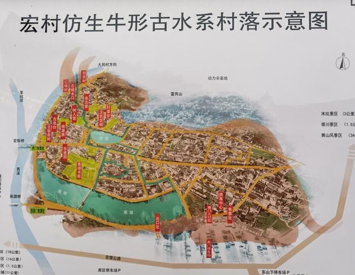 为了防止水涝和发展农业,宏村自古起就研究创造了一个水利系统。宏村自建水利系统创建于明代永乐年间,汪氏家族后辈汪辛,运用传统八卦阴阳学说,建设了水圳、月沼,花费三余年时间,初步完成宏村水系雏形;明万历三十五年(1607年),汪氏后人汪奎元等十七人扩建,建成南湖。宏村古水系历经数百年之久建成了一个古水系网络,其中的“月沼”“南湖”为徽州古水系文化的标志性景观。 宏村的这个水利系统从高空的角度看特别像一头牛,所以宏村又被称为牛形古村落。