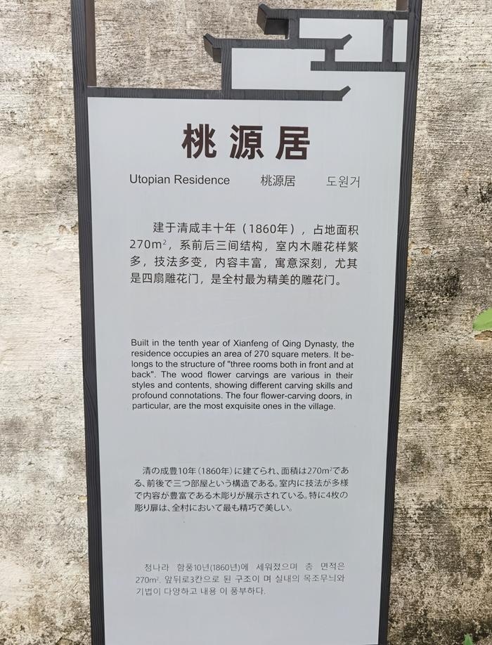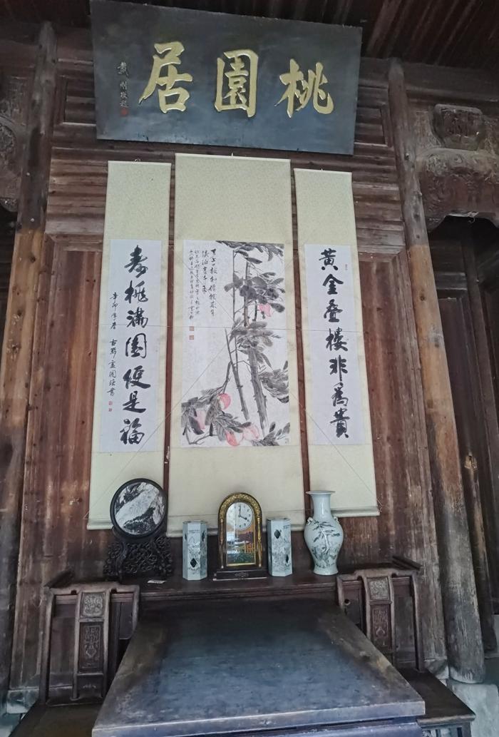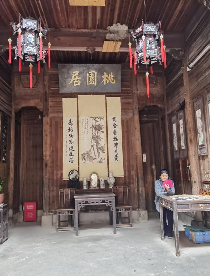 我先去看看桃源居。桃源居建于1860年,因房东曾于院内植一稀有品种的桃树而得名。桃园居虽说规模不大,但门楼砖雕和室内木雕堪称精品。书房中的四扇雕花门,可以说是宏村最精美的雕花门。