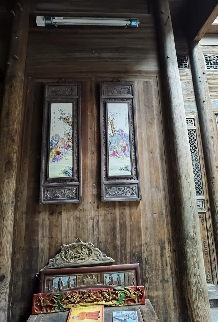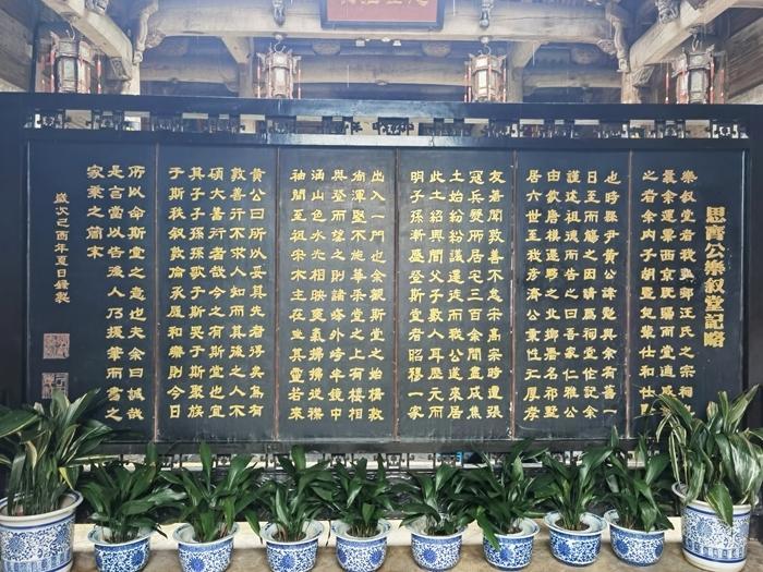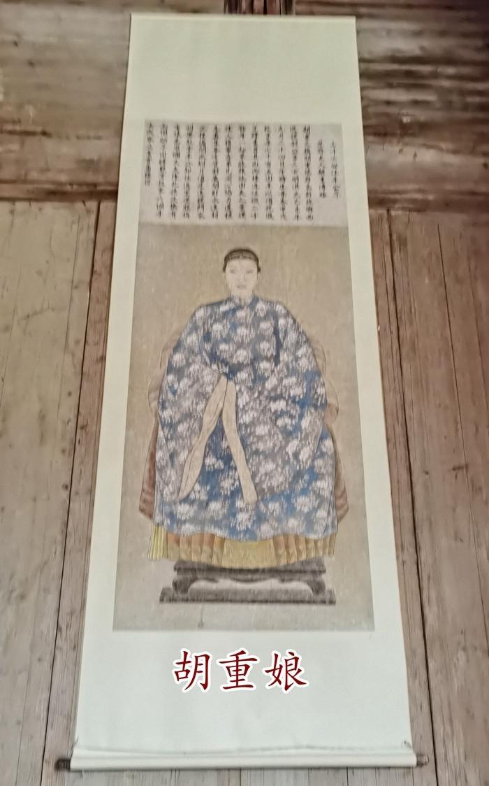 位于正中的是远祖,也就是汪氏家族的第一世祖周鲁颖川汪侯,他被誉为全天下第一个姓汪的人。 右边则是四十四世祖,即越国公显祖汪华,他是徽州地区第一个姓汪的人。 左边的始祖,是宋代的雷岗弘村六十六世祖彦济公,被尊为宏村第一个姓汪的人。 此外,内厅左廊还挂着一面“巾帼丈夫”的匾额,以及一位女性的画像。她就是祠堂修建人汪思齐的妻子,也是宏村水系设计施工的总筹划师胡重(1379-1454年),她被人们亲切地称为胡重娘。胡重娘真是一个古代的女能人,当之无愧的巾帼丈夫。